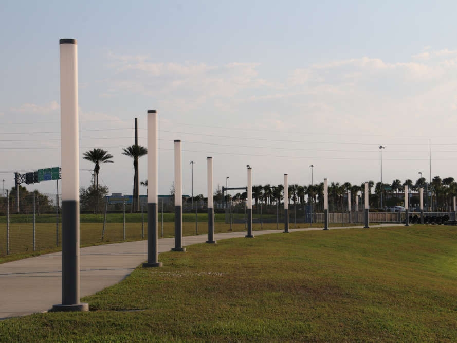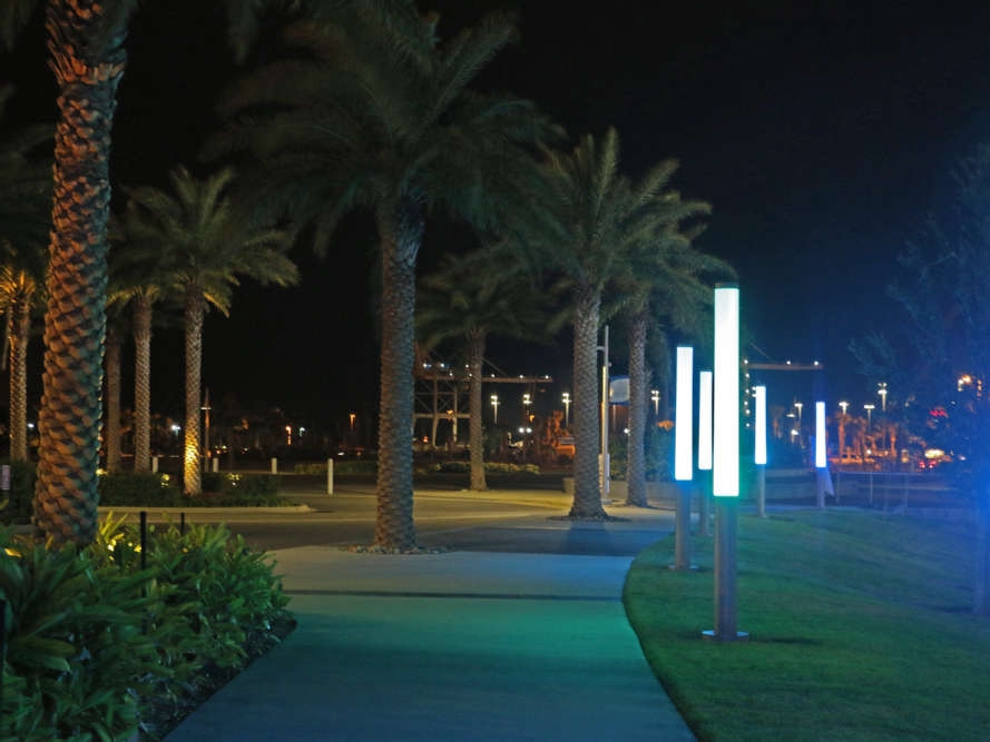 Solera provided WND-1 light column and bollards for a high traffic pedestrian area in Port Canaveral, FL. Tourists and local residents flock to the tower to see rockets launch from the Kennedy Space Center. The luminaires were DMX controlled to make them color changing.