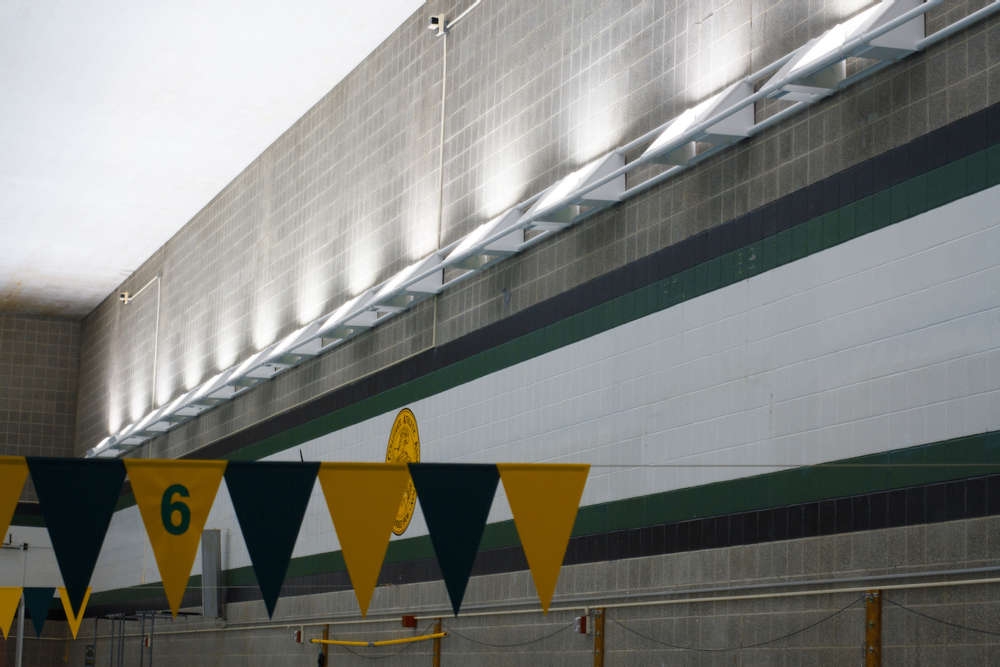 Solera provided custom Delta Rail systems for the NCAA pool at SUNY Oswego. The rails, in this case, were wall mounted, whereas, in standard situations, they would be suspended with aircraft cables. With adjustable lamp modules, the system uses indirect lighting to provide a minimum of 50 foot candles on the water.