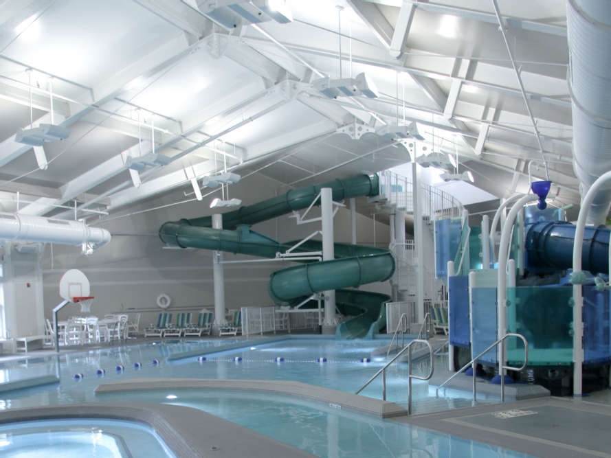 Solera provided twin Pendant (SIACs) on this project at Beachwood Resort, NC. The luminaires are adjustable and use indirect lighting to illuminate the pool area. In this case, they were mounted to the ceiling with pendant stems. SIACs are popular for pool applications as they can be specified with a Natatorium finish which resists most salts and alkalis from splash.