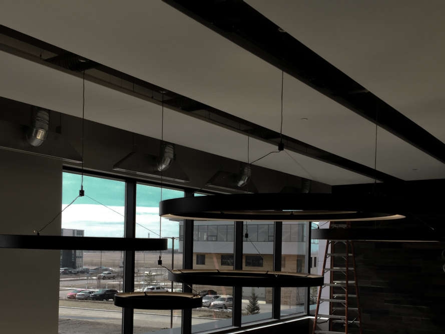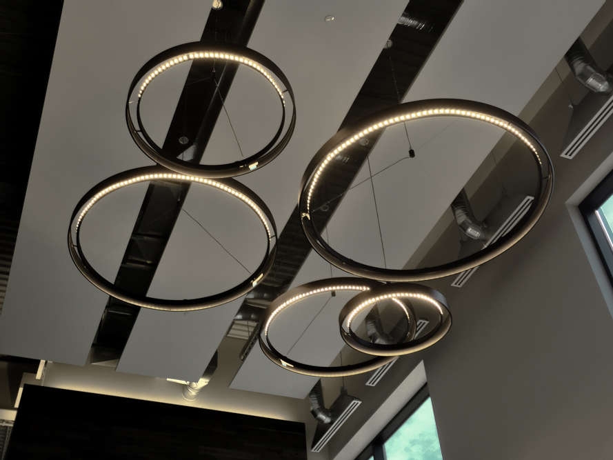 Solera provided CIRC-II pendants with different diameters for a Business Park in Edmonton, AB. This variation of the CIRC (Circular) series does not have a lens. This CIRC-II cluster adds a special aesthetic to the building lobby.